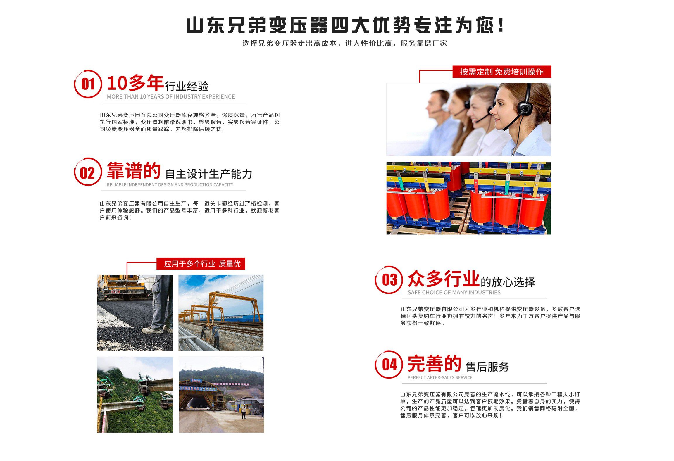 山東兄弟變壓器有限公司經營SCB10干式變壓器,SCB11干式變壓器價格,SCB12變壓器,SCB13干式變壓器,SCB14干式變壓器,SCB18干式變壓器等產品及用戶要求的特殊變壓器?! 」镜馁|量方針是:“顧客的滿意,是我公司的追求。”堅持質量,用戶至上,以質興業,以優取勝,愿為廣大用戶設計各種要求的變壓器,以求共同發展?! ∑髽I精神:“創新、求實、誠信、高效”?! ∑髽I作風:“嚴、細、實、快”。 企業工作方針:“加強內部管理,夯實基礎,全面提高職工整體素質,使企業管理水平再上新的臺階”。 公...